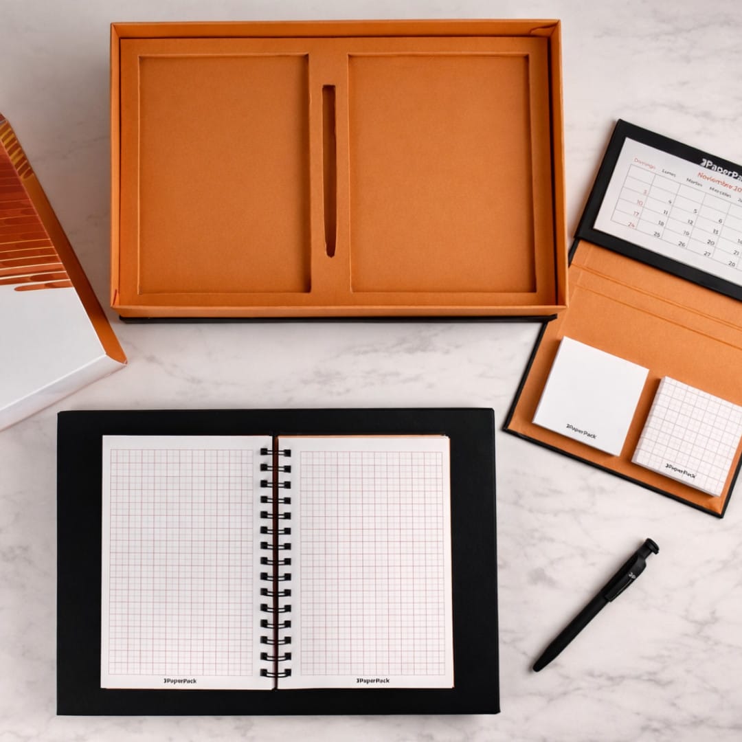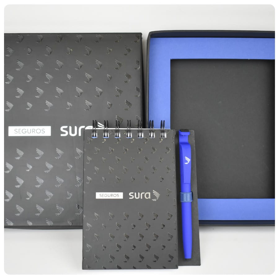 Regalo empresarial premium, caja con stamping, mas libreta e impresión en bolígrafo.